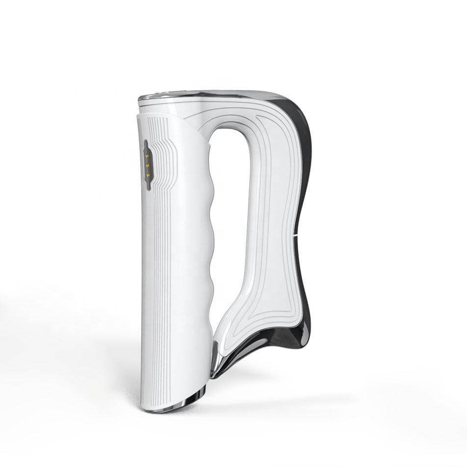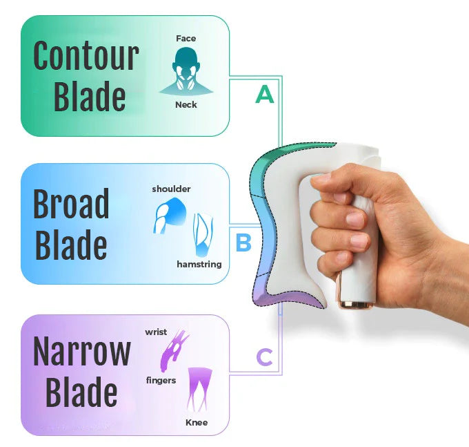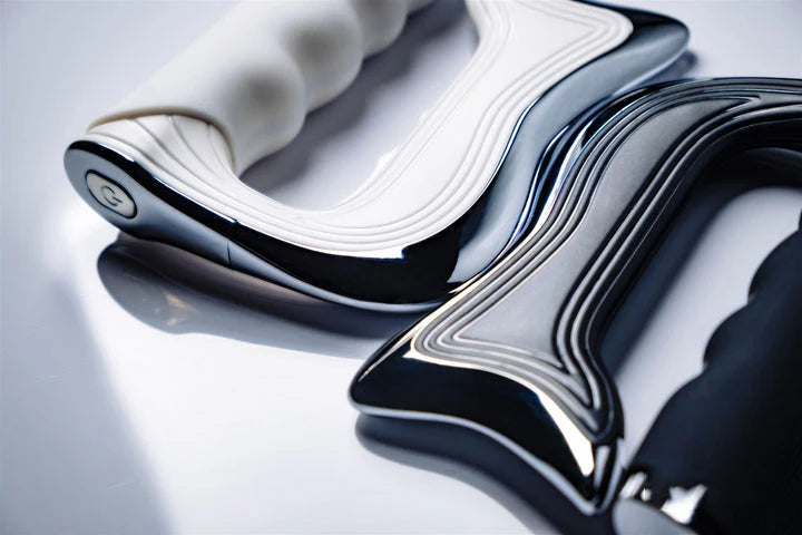 Det buede “blade”-design følger kroppens former og gør det nemt at anvende enheden på arme, ben, skuldre og ryg. Den ligger komfortabelt i hånden og glider let hen over huden, hvilket gør den intuitiv og behagelig at bruge i hverdagen.