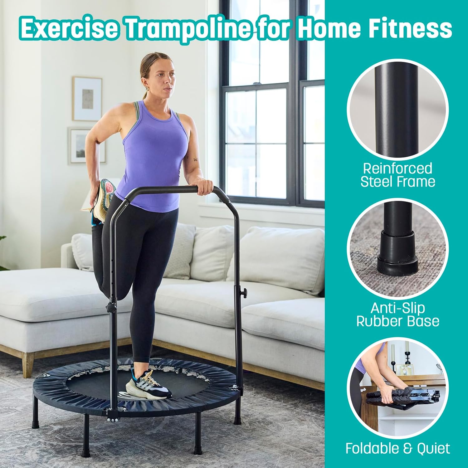 Med Foldbar Fitness Trampolin med Håndtag får du en sjov, effektiv og pladsbesparende måde at holde dig aktiv på. Forbrænd kalorier, styrk kroppen og boost energien – hjemme, når det passer dig. Klar til at hoppe i gang? 🏃♀️✨