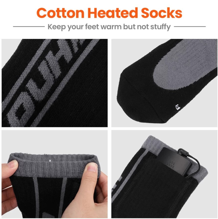 Vores opvarmede sokker er lavet af 95% bomuld og en indbygget energimåler, de elektriske opvarmede sokker er designet til at være fleksible og åndbare, og kan bæres komfortabelt med alle typer sko!