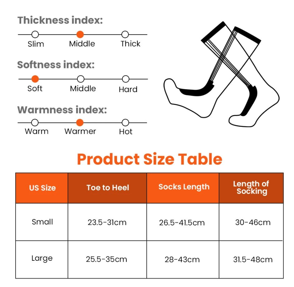 Disse opvarmede termiske sokker varmes op inden for 1 minut. Opvarmningsområdet er forreste vrist. Temperaturen er op til 120 °F for at varme dine kolde fødder i koldt vejr. Passer til vinter udendørs aktiviteter som vandreture, cykling, jagt, isfiskeri, camping, rejser osv.