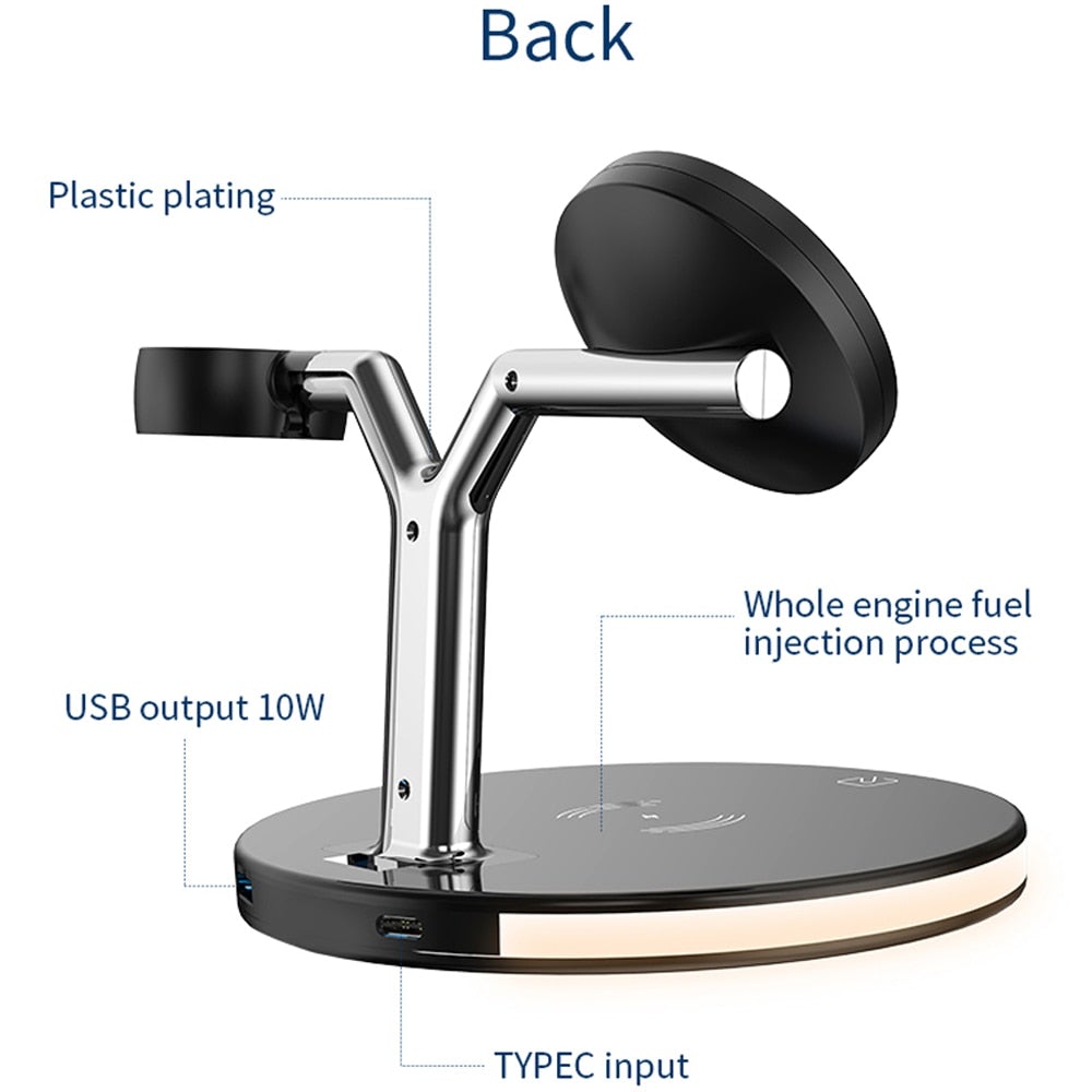 Fordi Magnetic Wireless Charger er udstyret med en magnetisk effekt, kan du fastgøre din telefon på den, og de praktiske kroge vil desuden holde dit smartwatch perfekt afbalanceret. På den runde skive kan du også sætte dine Airpods for at oplade dem. Magnetic Wireless Charger betjenes ved berøring, og den praktiske lampe gør opladeren til et nyttigt nattelys i dit soveværelse.