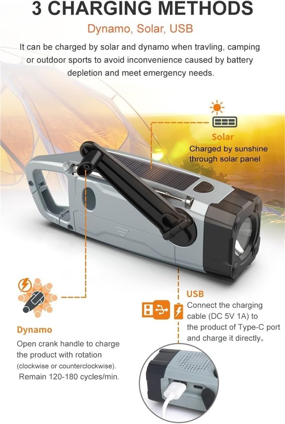 Uanset om du er midt i naturen eller under et strømafbrydelse, har du altid energi ved hånden. Den indbyggede 2000mAh batteripakke kan oplades via solenergi, USB eller håndsving, så du aldrig løber tør for strøm. Brug den til at oplade din smartphone eller andre enheder, og hold forbindelsen, uanset hvor du befinder dig.
