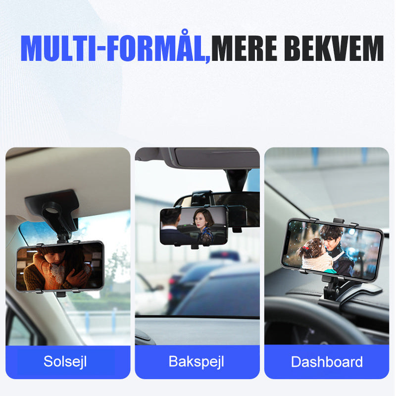 - Hurtig og nem betjening - Installer hurtigt bilholderen ved nemt at klippe basen fast på kanten af instrumentbrættet eller bakspejlet.