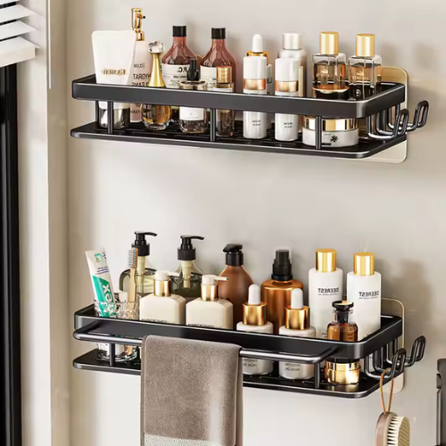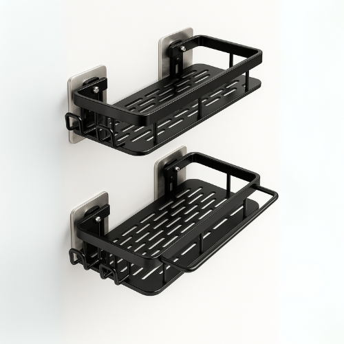 💫 Få styr på badeværelset – hurtigt og elegant Den vægmonterede shampooholder giver dig mere plads, bedre overblik og et pænere udtryk – alt sammen uden at røre en boremaskine.